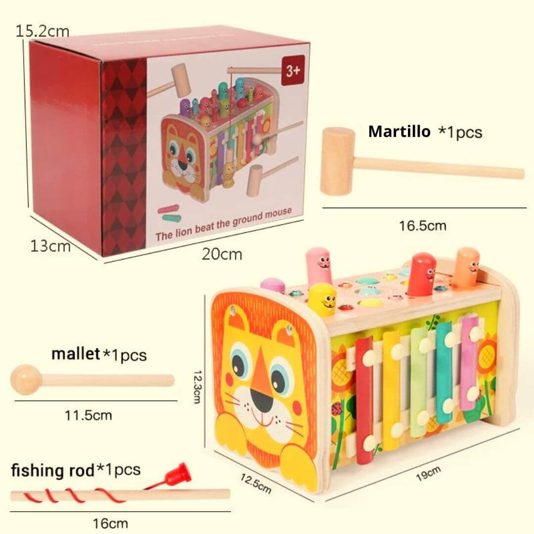 Este completo set Montessori en madera está diseñado para ofrecer a los niños de 3 años en adelante una experiencia de juego educativa y divertida. Incluye un martillo, un juego de pesca magnética, engranajes giratorios y una marimba, haciendo de este juguete multifuncional la elección perfecta para padres que quieren estimular el desarrollo de sus pequeños.